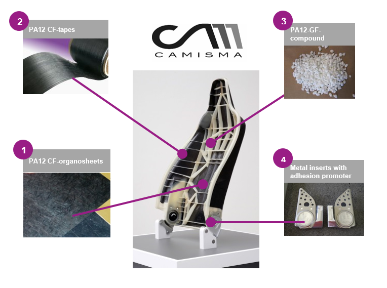 The matrix is made from specially developed high-performance polymers with a high glass transition temperature and therefore features good heat resistance. It is customized to high-strength endless fibers and allows production of parts that can be used even in areas exposed to extreme temperatures. Evonik is one of the leading suppliers of high performance thermoplastic resins such as specialty polyamides for use under adverse environmental conditions and polyetheretherketones (PEEK).
